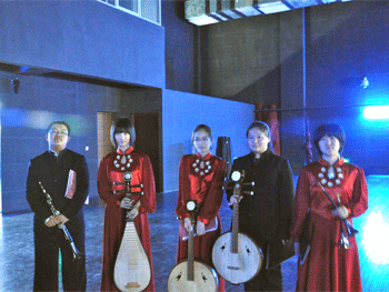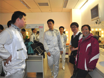 音乐会开始前附中副校长杜毓贞(右1)到后台慰问乐团师生 附中乐团学生团长张典(右2)带领4名团员与大学联合出演《花好月圆》