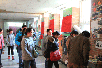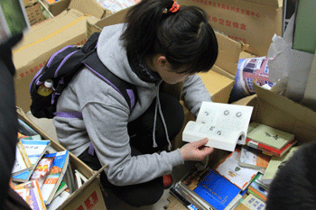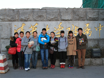 游学团同学在挑选附中同学捐赠的书籍 游学团师生在附中门前合影
