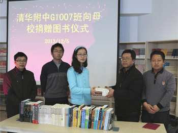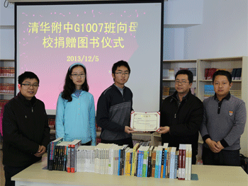 高1007班向母校图书馆捐赠图书 图书馆馆长万军民(右2)向学生颁发捐赠证书