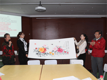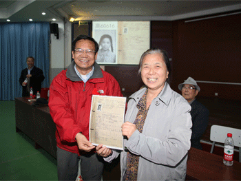 解巨钊副校长(左)向校友代表赠送其当年的学籍卡复印件 校友刘剑秋(左1)向母校赠送她画的国画《牡丹图》
