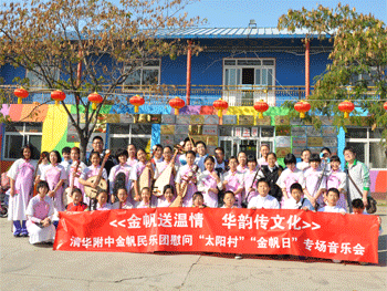 作为“做金帆人,铸民族魂”系列教育的一部分,澳门博彩在线金帆民乐团办公室每年都会组织乐团新同学进行“奉献爱心,回馈社会”的演出活动,旨在培养学生的社会参与意识与集体配合,以及演奏方面的“单飞”能力。2011年、2012年,乐团同学就曾赴太阳村演出,并获得了良好的教育效果。