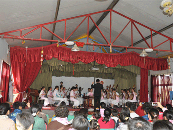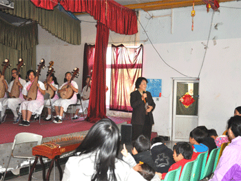 10点30分,慰问音乐会正式开始,乐团的同学们首先在胡军老师的指挥下,演奏了合奏《龙腾虎跃》,之后胡军老师按照中国民族乐器产生年代,向太阳村的60多名孩子以及50多名爱心市民分别介绍了中国民族乐器二胡、琵琶等乐器的历史和音色,之后,又为观众演出了昆曲《牡丹亭》、《渔舟唱晚》等曲目。音乐会最后,胡军老师向太阳村的孩子们介绍了民乐经典作品《瑶族舞曲》的相关知识,并指挥乐团演奏了此曲,同学们精彩的演奏,博得了太阳村同学以及观众们热烈的掌声。