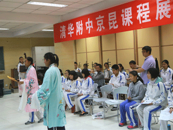 纪念一二•九革命短剧排练课(档案室摄影) 京昆课堂上学生模拟昆曲《牡丹亭.游园》(德育处摄影)