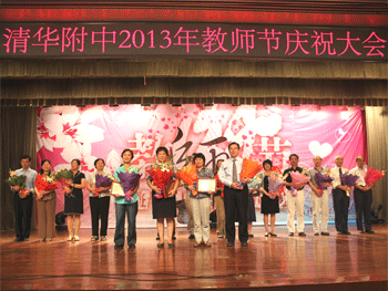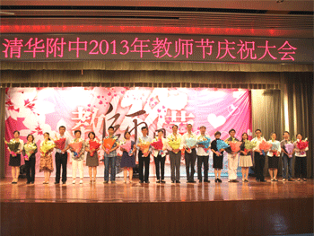 获奖教师代表接受学生献花 为从教30年(后排)及退休教工献花