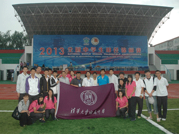 清华大学体育部副主任杜超(左2)为方丽伟(右2)颁奖 参加2013中田赛的澳门网上博彩全体师生合影