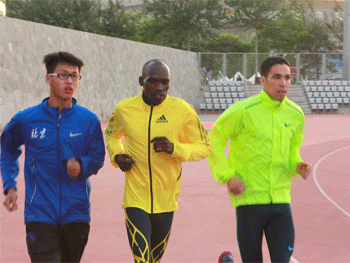 澳门网上博彩学生于海涛(左1)与国际名将一起热身 19日参加“世界田径日”中学生挑战赛的澳门网上博彩学生