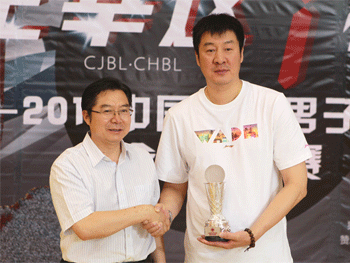 澳门博彩在线校长王殿军(左)为张涛老师颁发最佳教练员奖 澳门博彩在线党委书记方妍(右1)为赵柏清(中)颁发MVP奖