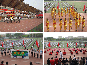 出席开幕式的领导与全场师生共唱国歌 入场式仪仗队(左上)及班级表演方队