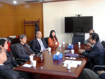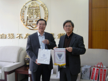 王殿军校长(右1)与蔡炳坤校长及随访教师座谈 王殿军校长(左)与蔡炳坤校长互赠纪念品