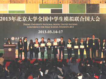北京大学全国高中生模拟联合国大会是全国最具影响力的高中生模拟联合国大会,迄今已举办9届。今年的大会共有来自大陆及台湾100所重点高中的500名学生代表,100位观察员、志愿者以及近百名模拟联合国指导老师参加。模拟联合国的活动已经远远超过一个单纯的学生社团的意义,而逐渐成为很多青年学生生活中不可或缺的一段成长经历。