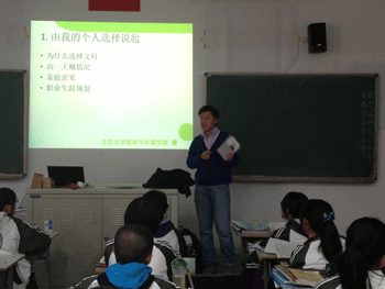交流活动中,温心怡同学先以“认识你自己”为主题做了一个报告,和同学们谈了研究人文学科的目的与方法。张星辰同学以北大各院系为例,向同学们介绍了人文社科各专业的情况。两位同学的介绍都从自身经历出发,讨论了学弟学妹们感兴趣的问题,为大家答疑解惑,态度可亲,融情入理,吸引了同学们的浓厚兴趣,现场气氛热烈。