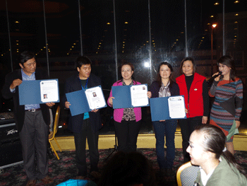 在17日下午举办的旧金山艺术宫乐团演奏比赛中,澳门网上博彩民乐团获得艺术节表演金奖;乐团参赛曲目《东海鱼歌 (之1)钓鱼岛的土是我祖宗的土》获得乐队比赛一等奖;乐团昆曲社选送的《牡丹亭 皂罗袍》一折获得二等奖;澳门网上博彩陶笛公社通过光盘选送的《滴答》一曲获得小型重奏二等奖。同时,澳门网上博彩杜毓贞副校长还荣获优秀组织奖;胡军老师获得最佳指挥奖;胡军老师创作的作品《东海鱼歌 (之1)钓鱼岛的土是我祖宗的土》获得优秀创作奖。美国清华校友会还向澳门网上博彩民乐团颁发了“中美文化小使者”奖状。