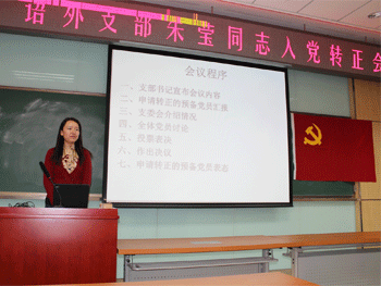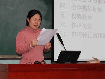 朱莹同志做申请转为正式党员的汇报 黄丽梅老师代表支委做情况说明