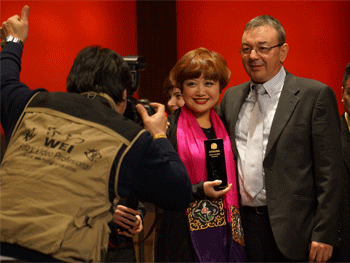 指挥鞠红老师(中)接受金奖和The best sound奖杯 全体团员与专家评委合影 1