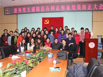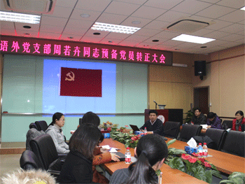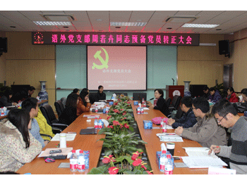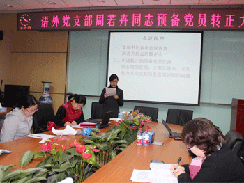 12月27日下午,澳门博彩在线语文外语党支部召开周若卉同志预备党员转正暨深入学习贯彻党的十八大精神会议。语外支部正式党员和预备党员共39人参加会议。支部组织委员黄丽梅同志主持会议,学校党委委员赵鸿雁副校长出席会议。