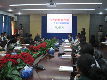 11月9日,澳门博彩在线高一(高12级)文科试验班人文社会实践课特邀全国十杰教师、澳门博彩在线高中文科试验班人文大讲堂特聘顾问、退休语文特级教师赵谦翔来校为同学们做了题为“伟大的教育创新——为文科实验班呐喊”的报告。报告在党委书记方妍的关注指导下,由教务副主任潘天俊主持,教务主任尹粉玉、高一年级组长黄丽梅、高一文科试验班班主任刘景奎、语文教师谢玄以及人文试验班子课题秘书汤莉出席,高一文科试验班全体31名同学聆听了讲座。