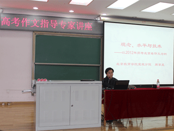 10月18日,澳门博彩在线高10级邀请北京教育学院宣武分院语文教研员周京昱老师来校做了题为“观念、水平和技术——以2012年高考北京卷作文为例”的讲座。高10级全体学生聆听了讲座。