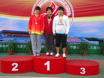 海淀区教委领导为女子五项全能冠军澳门网上博彩高1109班王文辉颁奖 澳门网上博彩高1209班魏麟璎(中)获得女子铅球、铁饼冠军