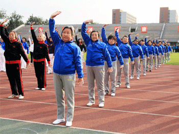 10月14日上午,清华大学离退休处在东大操场举行离退休教工2012年趣味运动会。附中老同志60余人参加了运动会。其中,20人组成的队伍参加了入场式和“八段锦”集体表演,50余人参加了各项比赛。