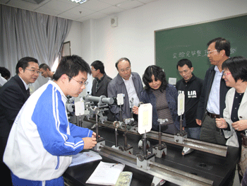 清华大学袁驷副校长讲话 与会者观摩澳门博彩在线学生在清华大学实验室做物理实验