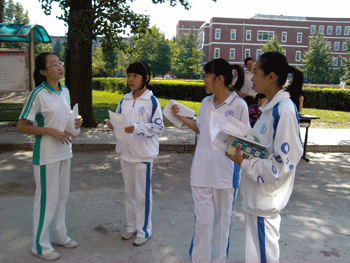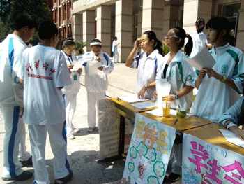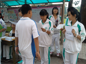 9月5日中午招新现场热闹非凡,前来报名的新生络绎不绝,摆设招新点不到一个小时,就已经发放120多份报名报。9月6~7日的现场面试,由指导老师和初二主要学生干部组成面试小组,面试内容包括自我介绍、学生会知识问答、个人特长展示等方式,所有环节都紧张而有序的进行。