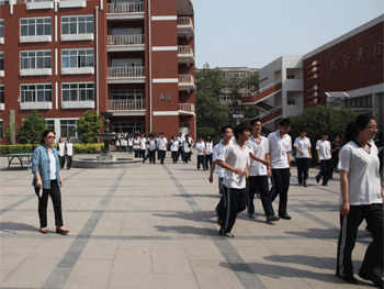 高中部学生迅速有序地撤离教学楼 杜毓贞副校长(左1)等全程引导学生撤离