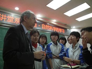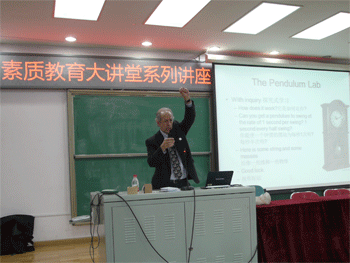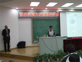 在讲座的开场,艾森克雷夫博士就从同学们熟悉的单摆出发,对单摆的周期问题稍加延伸,便引申出了这样一个问题:处理科学问题时,为何常常会掉入定式思维?经过解释,同学们都明白了其中的道理。之后,艾森克雷夫博士又进行了一系列有趣的小活动,包括不用尺而测量硬币的面积。同学们在艾森克雷夫博士的带领之下纷纷动手,利用概率方法给出了实验测定。由此,艾森克雷夫博士便引出了卢瑟福的实验,该实验表明了原子核的存在并计算了其大小。同学们经过这样的点拨,都明白了其中的奥妙。最后,艾森克雷夫博士组织同学们讨论了月球上的体育运动,让同学们体会到,科学可以是贴近生活的,但是却又高于生活,因为它不仅需要对生活的观察,更需要严谨的态度和孜孜不倦的探索。艾森克雷夫博士最终指出,科学的研究不在于结果,而在于探求的过程。