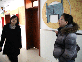杜毓贞副校长(右)参观朝阳学校校园文化墙 两校干部教师合影