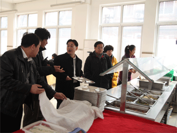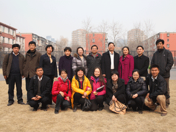 方妍书记(左4)带领教学部门进行工作交流 解巨钊副校长(右3)带领行政后勤部门考察朝阳学校食堂