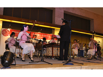 第三部分“华乐颂祖国”,乐团同学在陈克老师的指挥下,由袁焕杰同学担任独奏、乐团演奏了著名作曲家、指挥家刘文金先生30年前构思与联合国总部的《长城随想曲》和20世纪华人经典乐曲《瑶族舞曲》,赢得了各国观众经久不息的掌声。