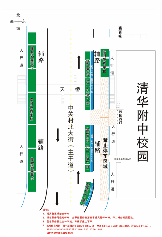 车辆要安全停靠在允许临时停车的指定位置。放学时,家长接送车辆可按照《澳门博彩在线校园周边临时停车示意图》安全停靠在“绿色”区域,但不要占用“橙色”禁停区域,不要堵塞过街天桥出入口及桥下自行车停放区出入口。
