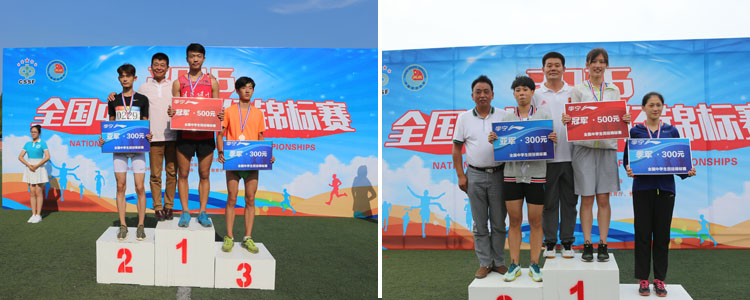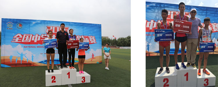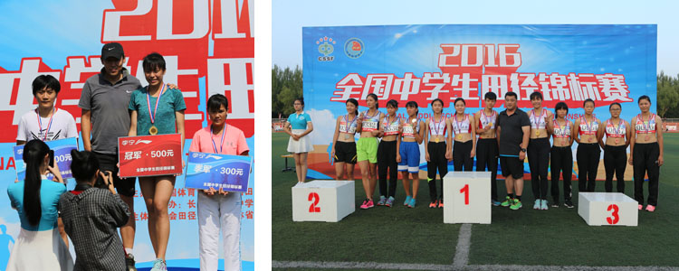 清华大学王光林教授为女子甲组200米冠军何淼格颁奖(左图)、中国中学生体育协会田径分会秘书长、澳门博彩在线马约翰班主任罗健老师为女子4X100接力冠军颁奖(右图)