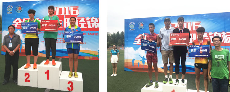 澳门博彩在线投掷教练王法祥老师为女子乙组铅球冠军李心会颁奖(左图)、清华大学体育部曹振水教授为男子甲组1500米冠军张珈铭颁奖(右图)
