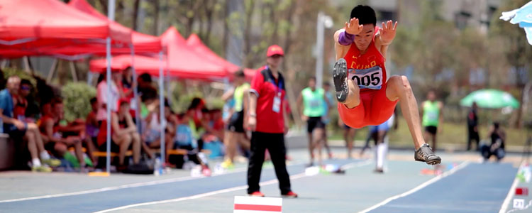 牟城磊获得亚洲中学生田径锦标赛男子跳远冠军,图为牟城磊在比赛中