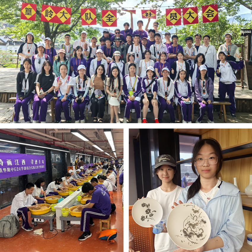 师生在悬崖上的古村婺源篁岭合照,同学们在陶艺研学基地体验陶泥捏塑、拉坯与釉上彩创作,部分同学的釉上彩创作