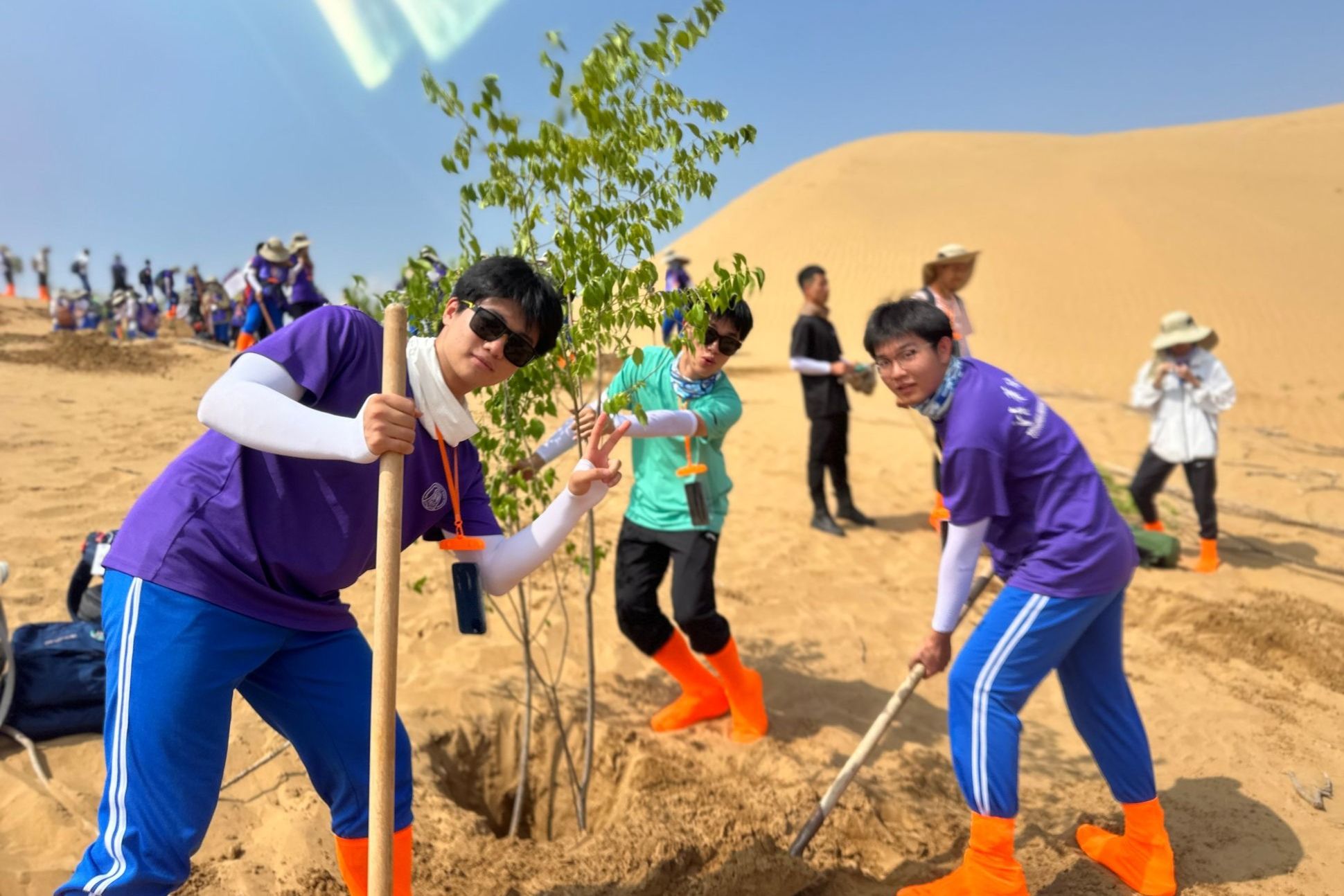 7月14日上午,全体师生来到库布齐沙漠植树基地,种下了近300棵树苗。这些幼苗既是生态改善的希望,更是青春担当的象征,为西部荒漠化治理注入属于澳门博彩在线学子的力量。