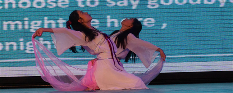 10年级学生王豆豆(左1)、曹钟云为原创诗朗诵《离人心上》伴舞