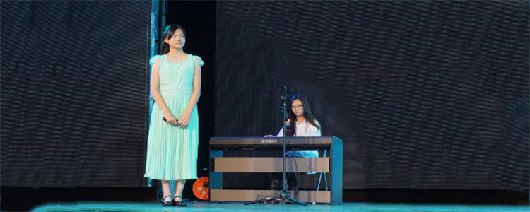 11年级学生马倩怡(左1)、丰最怡(左2)、杨爽然为原创诗朗诵《离人心上》伴奏
