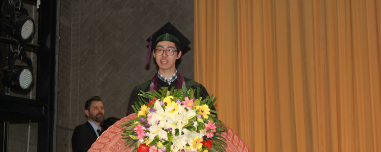 为了更好地感受毕业生在国际部的成长与生活,学校邀请毕业生代表谈汇东同学发言,他讲述了自己在日常的学习中如何发现自己的“真爱”,并将其发展为自己的人生目标。他对国际部所提供的优质教育资源、宽松的学习环境和教师们的专业指导及敬业精神表达了深深的感谢。