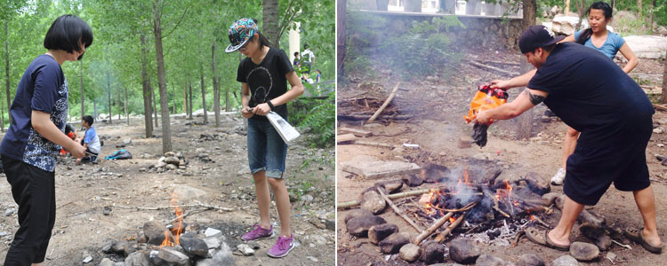 在简单吃过自带的午餐之后,孩子们就紧张地投入到下午的拓展实践活动中。首先,每个小组就地取材,利用《Hatchet(手斧男孩)》学到的技巧亲手搭建能够让自己在野外藏身的避难小屋。片刻的休息之后,我们还进行了孩子们非常喜爱的欧美传统运动游戏——夺旗(Capture the flag)。在一番大汗淋漓的激战之后,大家开始一起砍柴、生火,准备我们的篝火晚餐。每个学生在自己的锡纸上抹上花生油,放上土豆、胡萝卜、洋葱、青椒、鸡肉、猪肉等食物,然后浇上自己喜爱的调料并包裹好,最后放置在火堆上烧烤。