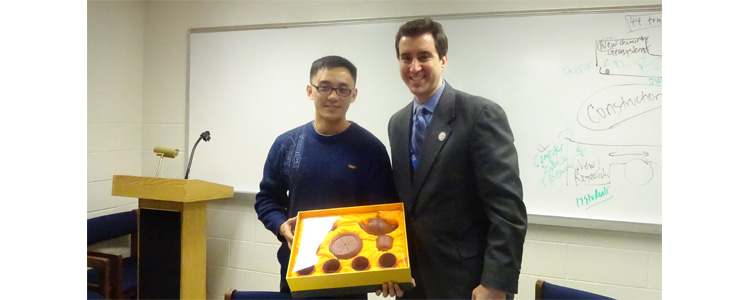 澳门网上博彩教师代表周喆(左)与托马斯•杰斐逊科技高中校长互赠纪念品