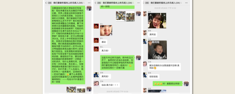 面对特殊时期学生的焦虑,身为一名党员班主任,我必须要有所作为,为学生撑起一片天。恰逢看到距离高考百日,名校纷纷致信高三学生,我就收集了班上学生们心仪的大学写给高三学子的一封信转发到班级群,“清华大学:愿你成为穿透风雪的一束光。北京大学:埋首积蓄力量 静待春暖花开。复旦大学:我们不慌张,我们总有力量……”,并附上自己写给孩子们的一段话。看到孩子们积极的回应,觉得鼓舞士气做到了,同时自己也被孩子鼓舞了,师生纷纷在班级群互相打气,做彼此温暖的支撑。