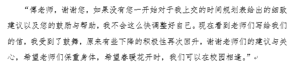 作为任课教师,她了解每一位学生的需求,深知学生目前的心理,为了激励学生,树立牢固的信心,她常常同学生推心置腹的沟通,并通过一封信的形式在线激励学生,打消学生那颗不安恐慌的心。