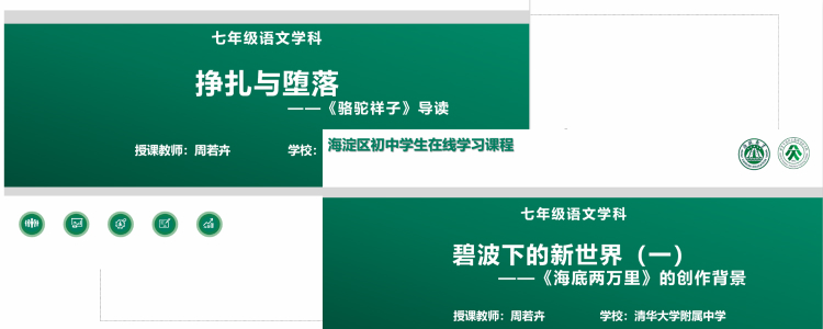 疫情期间,我接到北京市教委的任务,录制了疫情初期面对北京市初三毕业生的“名著阅读复习指导课”。课程在北京卫视和歌华有线进行播放,仅北京卫视上的视频点击量就达到了70多万次。目前,正在完成北京市第二阶段线上教学的任务。前后为北京市教委录制相关课程140分钟。我还接到海淀区教委的任务,合计为海淀区教委录制微课及设计相关配套资源6次,视频录制150分钟。