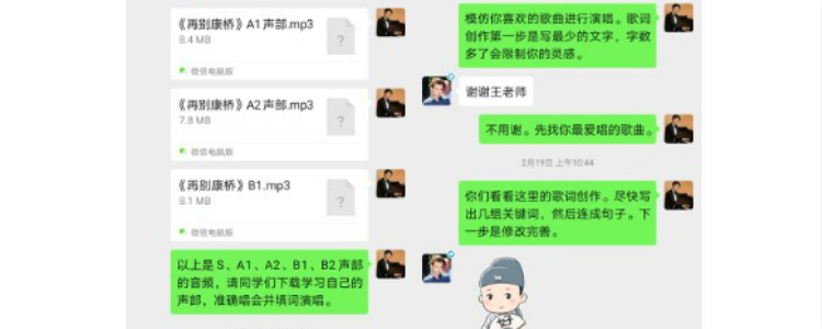 我以中国古诗词作为课程导入来提升艺术审美境界;以朗读意大利文的音乐术语来营造地道的音乐情境;以自身的音乐创作来启发学生思辨。每一次个别指导前,我会对学生的音乐创作逐字逐句进行修改与完善,并指导演唱、演奏和录音技巧。我还制作了六个声部的音频供童声合唱团练习。对于同学们的音频作业,我运用电脑作曲软件制作音频来回复,帮助他们更好地处理复杂的节奏。