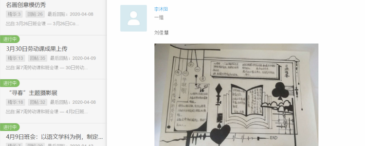 作为初三毕业班班主任,除了完成网上教学工作,我还进行了大量德育工作。引导班级学生建立学习小组群,邀请任课教师作为导师,及时为学生解答学习和思想上的疑惑。为学生写了家书,录制鼓劲视频鼓励大家。目前进行了“问候春天”“自己动手做道菜”“梦想合伙人”等班会。年级公众号中的各班优秀班会作业,也让学生互相学习,丰富毕业班学生的学习生活,调节情绪。