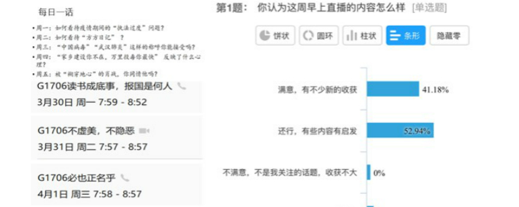 我坚持每天早上八点和学生进行直播连线,每周有不同的主题,比如学科知识讲解、社会热点话题关注、学习方法和经验交流等。学生们在老师和同学的陪伴交流中开始一天的学习,新知识的学习和新闻话题的讨论也拓展了学生的视野,打破了居家自主学习的单调。比如之前对疫情期间热点问题、新闻事件的讨论,学生们非常踊跃,积极参与,我也通过直播引导学生理性正确看待这些现象。