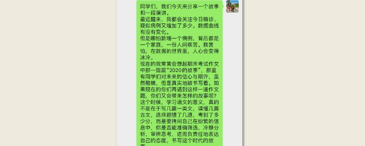 高考延期消息发布后,学生和家长表现出了情绪上的波动。此刻,我感觉到,班级大家庭的成员们,需要听到我的声音。于是,我给孩子们写了一封短信,也转给了家长们,收获了良好的反馈。其实,计划改变,本来就容易引起不适,在居家学习、备考压力大的当下,激起负面情绪也是理之必然。面对突发状况,及时地进行疏导,引领学生以更广阔的胸襟来看问题,是在特殊时期作为班主任的职责与使命。