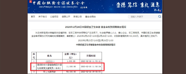 2月26日中国初级卫生保健基金会官网公布收到捐赠善款情况