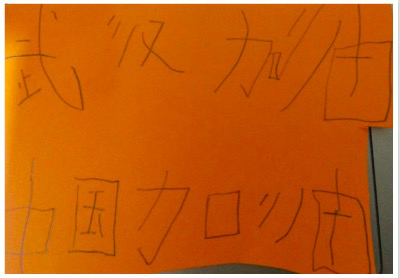 “北京疫情特别严重的时候,李文平校长将自己的头像换成了国旗。儿子看到李校的头像特别激动,指着说:国旗!国旗!我当时的头像右下角有一面小国旗,他说我对祖国的爱心不够大。”于是,还不会写字的小朋友就画出了这幅“字画”。
